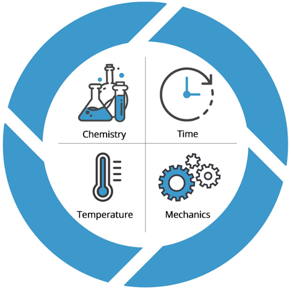 De Sinner’s Circle laat zien dat een effectief reinigingsproces afhankelijk is van vier variabelen. Om een consistent resultaat te behouden, moet een vermindering van de ene factor doorgaans worden gecompenseerd door een toename van een andere. [1]